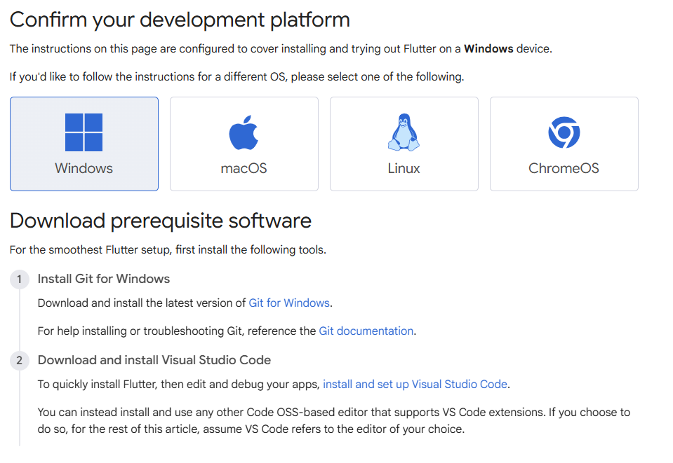 Since we are using Flutter in a Windows environment, select Windows on the following page and install the Flutter SDK: